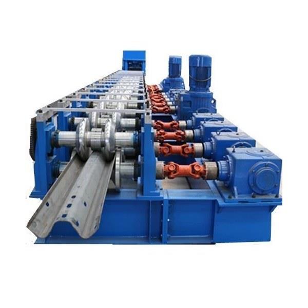 Industrial guardrail roll forming machine for mild steel. Operates at 5.5 m/min with 16.5KW power, producing guardrails efficiently. Suitable for industrial applications.