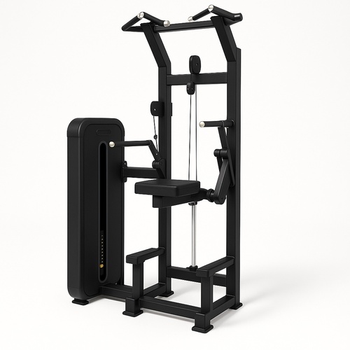 A single-station gym dipchin assist machine manufactured in India. Designed for user choice with manual operation. (Note: No PVC, PU, or steel components specified for handles/frame).
