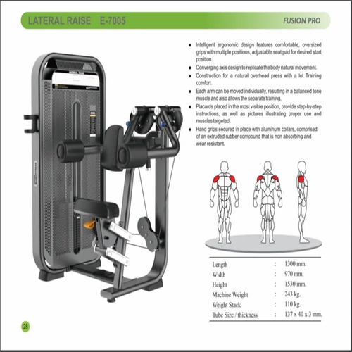 Powder-coated mild steel lateral raise machine for gym use. Available in custom colors and sizes as per customer choice. Made in India.