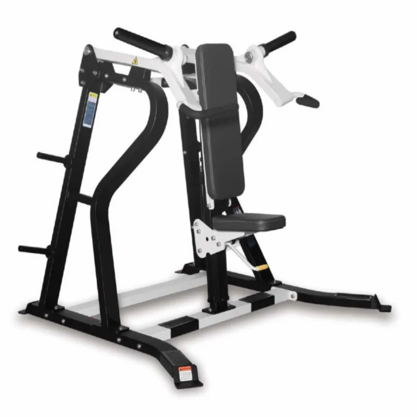 Plate loaded shoulder press machine for commercial gyms. Constructed from MS with polished finish, red and black color. Size 1820x1190x2100mm, 40kg weight.
