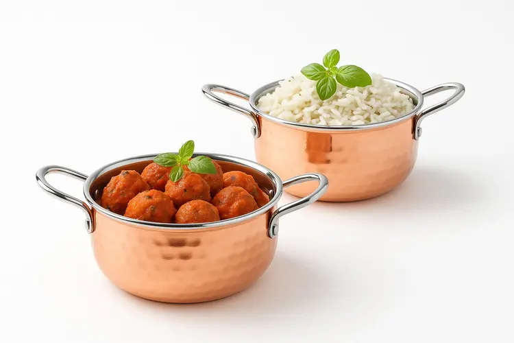 Round, polished copper handi with hammered design. Standard size, plain pattern. Durable copper material for authentic cooking and serving.