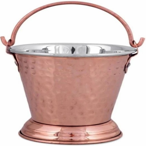 This 400ml copper serving bucket boasts a hammered finish for a unique look. It stands 15 inches tall and is equipped with a handle. Available in copper and silver.