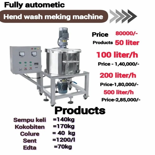 Stainless steel hand wash making machine with a 50 L application capacity. Designed for efficient production and packaging.