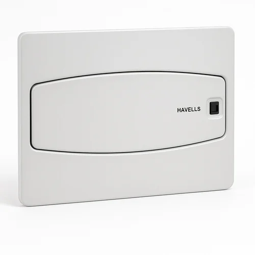 Havells SPN distribution board, 16 way, double door. Constructed from mild steel (MS) in light grey. Rectangular shape with a weight of 350gm.