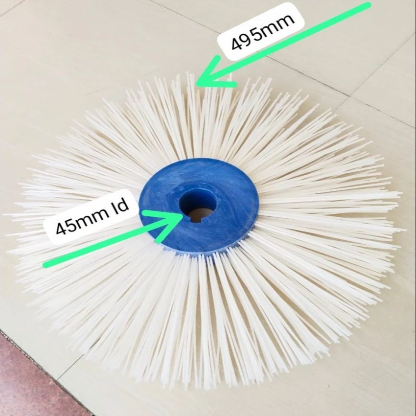 Polypropylene bristle broom brush with HDPE base. 20-inch outer diameter, 6.5-inch brush length. Medium stiffness. New, Made in India, minimum 50 pieces.