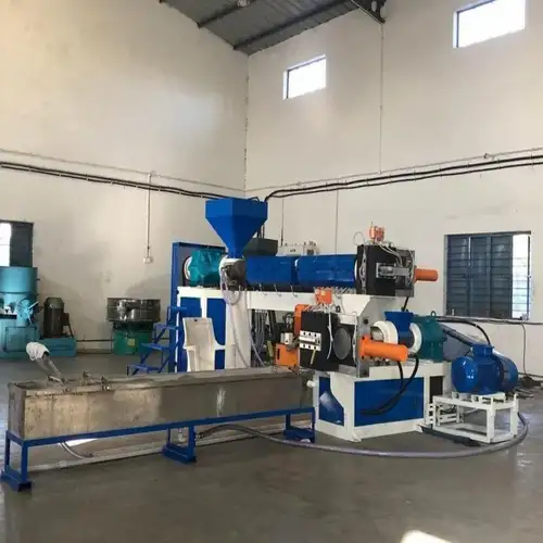Automatic HDPE recycling extruder machine. With a production capacity of 100 kg/hr, this Indian-made machine efficiently processes HDPE waste.