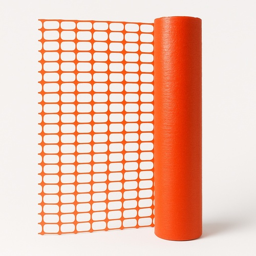 Orange HDPE barricading net for safety purposes. 50-meter roll with a 10-year lifespan. Paint-coated finish, manufactured in India.