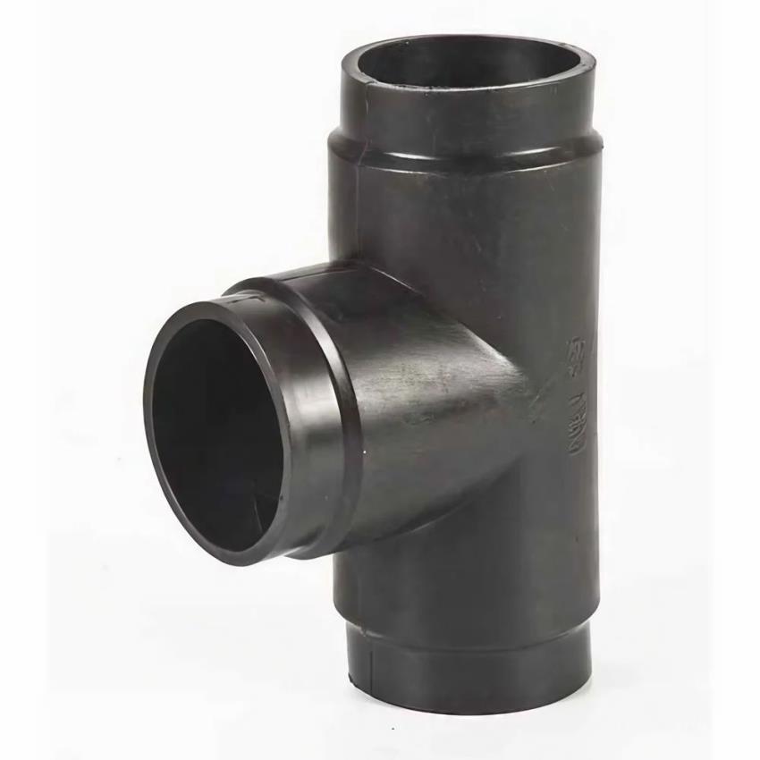 HDPE Tee fitting for welded connections on structure pipes. Durable black HDPE material ensures robust performance for infrastructure applications.