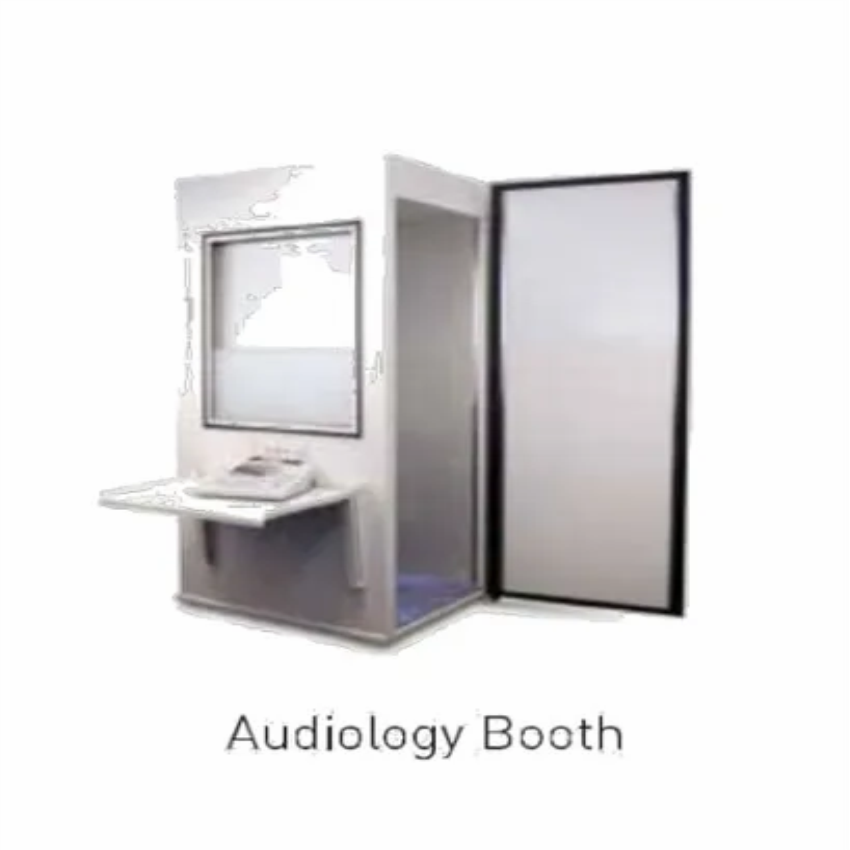 Acoustic enclosure designed for audiology testing, providing a controlled environment. Offers sound isolation for accurate hearing assessments and measurements.
