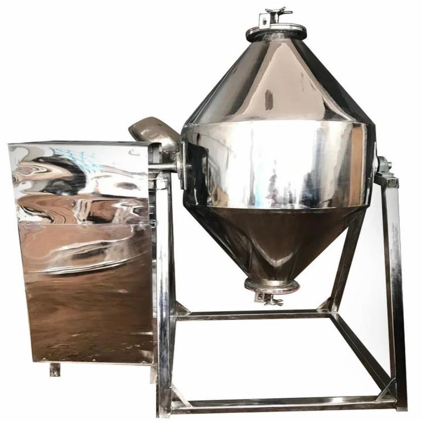 Single-phase electric double cone blender, 40 kg capacity. 0.5-3 HP power, 100-500L working volume. Polished, glossy finish. Made in India.
