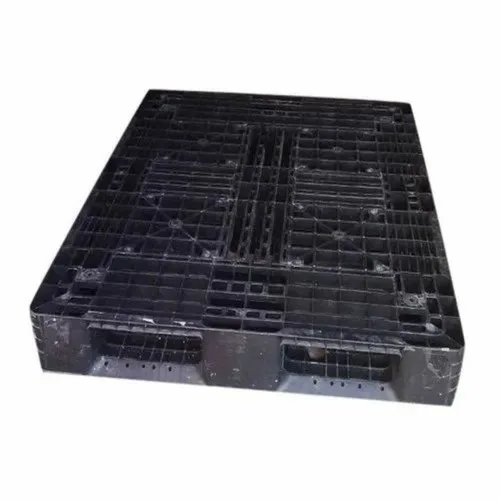 Black heavy duty export plastic pallet made in India. Designed for industrial use with a storage capacity of 200 kg. Available in stock.