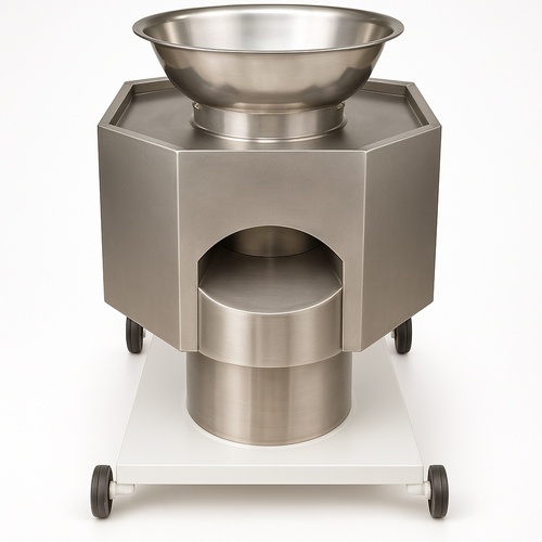 Semi-automatic stainless steel heavy-duty potato slicer with production capacity exceeding 500 kg/hr. Robust design for intensive commercial applications.