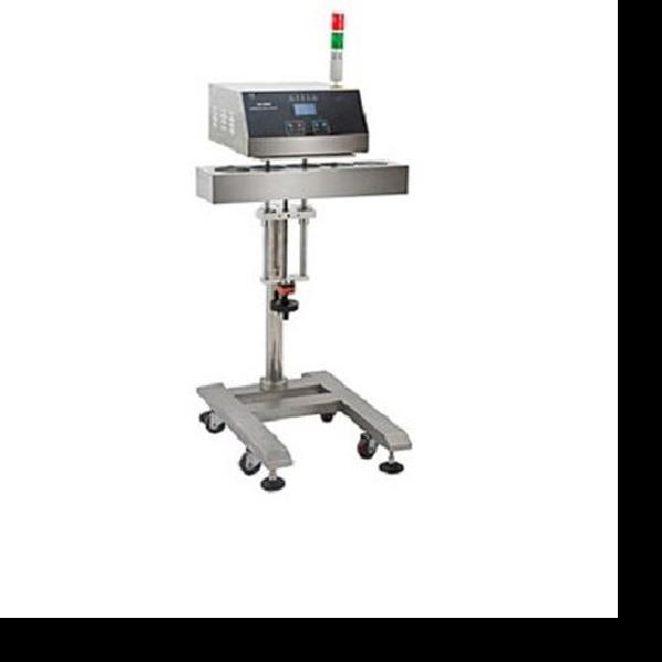 Automatic induction sealing machine with 120 bottles/minute capacity. Features stainless steel body, 400V, 50Hz operation, and 200W power consumption. Made in India.