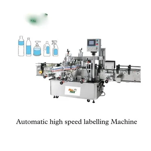Automatic, high-speed labelling machine constructed from SS. Operates on 220-240V, 3 Phase power, with a frequency of 50-60 Hz. Made in India.