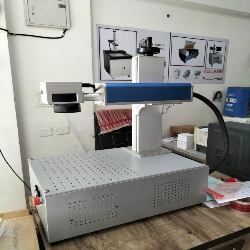 Automatic 20W high speed steel laser marking machine, model SAL 20. Marks high speed steel with 10-15 sets/month capacity. Operates on 220V.