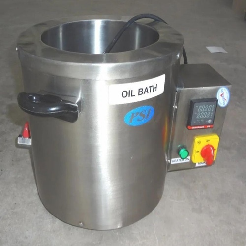 High temperature oil bath device for laboratory applications. Made in India, featuring a silver color. Designed for new applications requiring precise elevated temperatures.