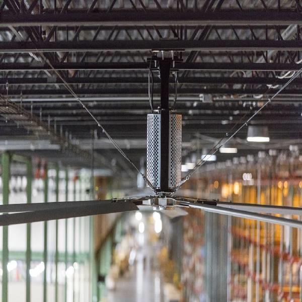 HVLS Machine with 37000 CFM max airflow and 0.3 kW max power. Efficiently circulates large air volumes for optimal environmental control.