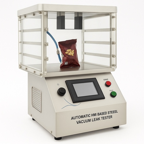 Automatic HMI-based vacuum leak tester made of stainless steel. Operates on 220V AC, with a cycle time up to 999 seconds. Tests up to 600 mm Hg.