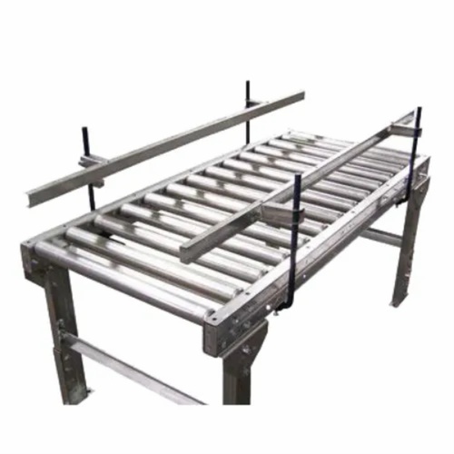 Indian-made industrial roller conveyor. Stainless steel construction with steel rollers. Three-phase electric powered, 415V, 50 Hz. Available in stock.