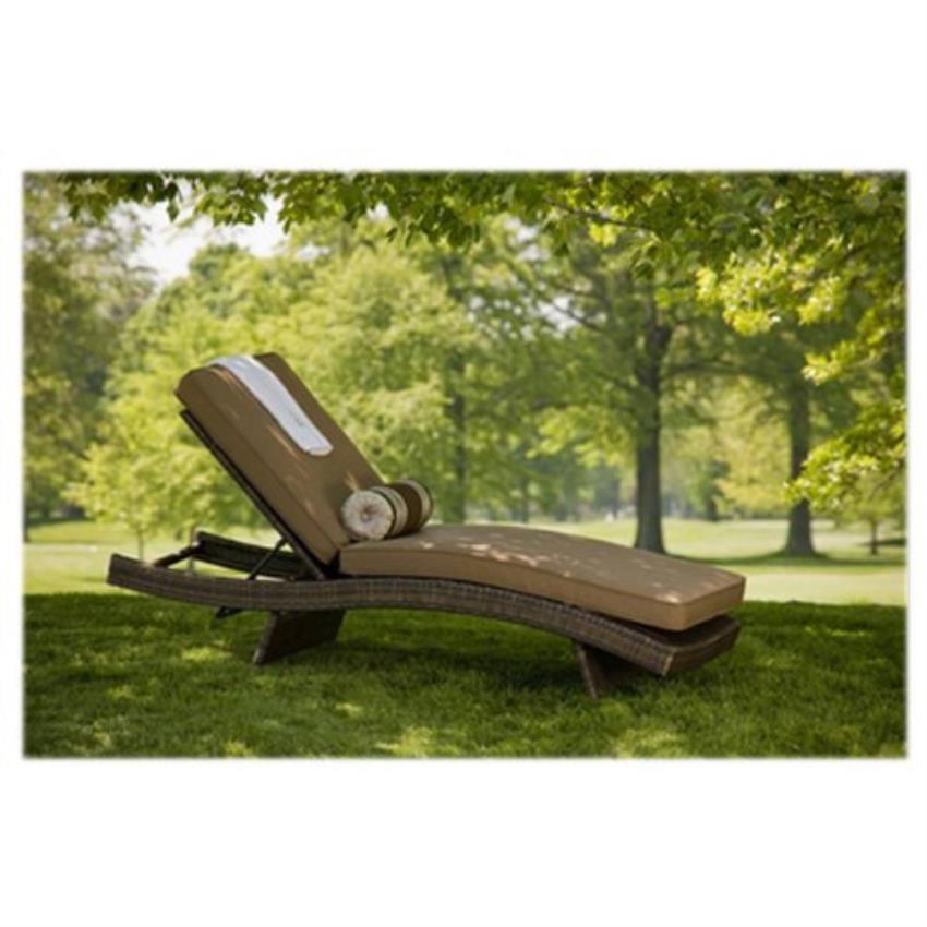 Brown wicker lounge chair for garden use. Features fabric seat material and polished surface finish. Designed for single-person seating.