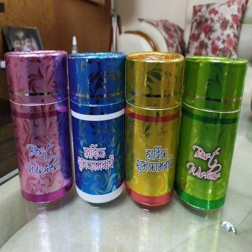 Round box designed for Holi gulal packaging. Convenient and secure container for vibrant powdered colors, preserving freshness and preventing spillage during transport and display. Ideal for festive distribution.