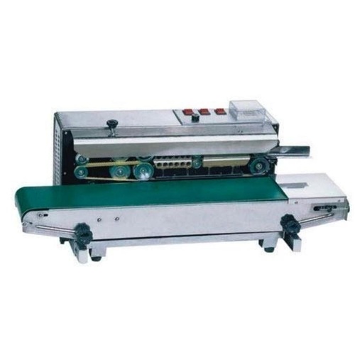 Automatic horizontal band sealer for plastic pouches. Offers 2000-3000 pouch/hour capacity. Operates on single-phase power for efficient packaging.
