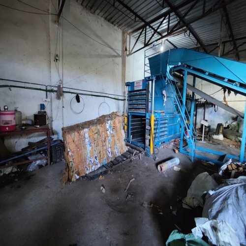 Semi-automatic horizontal paper baler with 50 ton/day capacity. Features 90-ton max force, 25 HP motor, and output paper width up to 500mm.