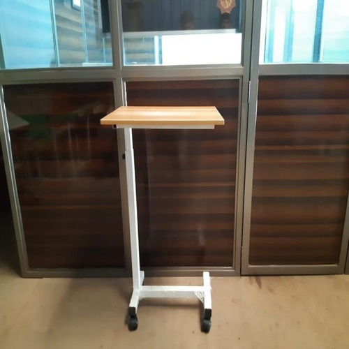 Hospital overbed food trolley with height adjustable mild steel frame. Features 50mm castors, a 1.2mm thickness, and 1 platform. Dimensions: 600mm x 450mm x 1000mm.