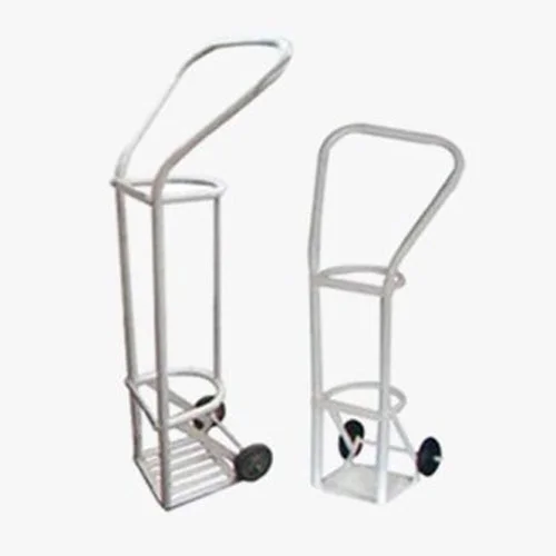 Mild steel oxygen cylinder trolley for hospital use. White color, designed to carry one oxygen cylinder. Made in India.