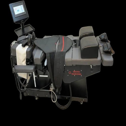 Adjustable robotic spinal decompression machine for hospital use. Features electric control and 4 wheels for mobility. Available in 30 colors with a 1-year warranty. Made in India.