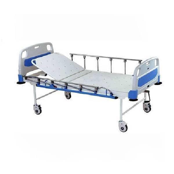 This semi Fowler bed is made of mild steel with a load capacity of 150 kg. Features include adjustable backrest, collapsible railing, and 4 brake castors for mobility. Size: 6x3 feet.