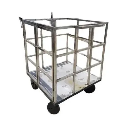 Hospital cage trolley made of polished mild steel with 4 wheels. Offers a load capacity of 200 kg. Dimensions: 3 L x 3 W feet. Suitable for medical transport.