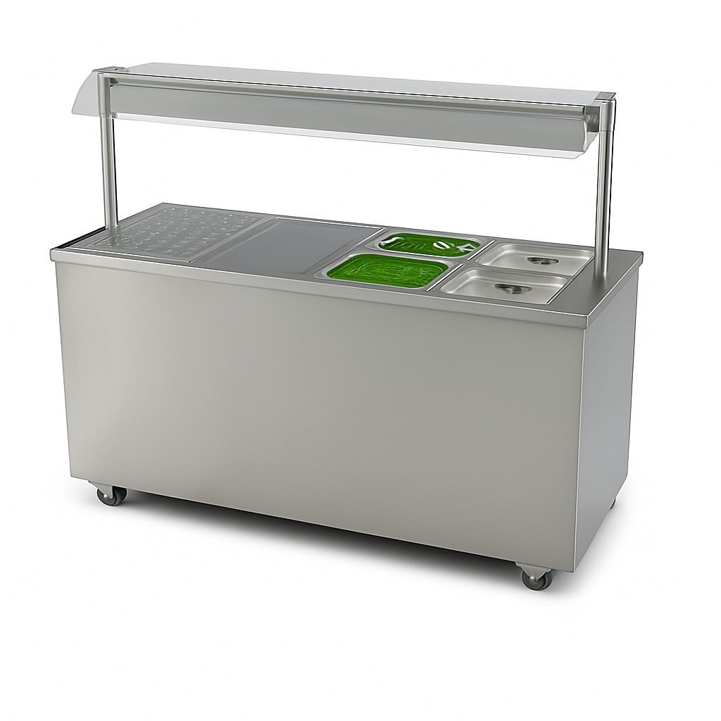 Four by three feet Bain Marie hot counter machine for hotel/restaurant use. Features polished SS 304 surface finish and four wheels for mobility.