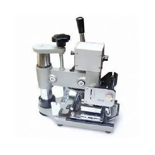 Semi-automatic hot foil stamping machine with a mild steel body and stainless steel rod. Operates on 50 Hz and 220 V power.