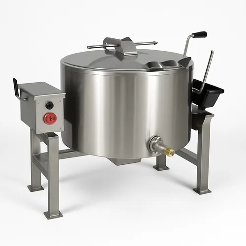Silver stainless steel LPG gas bulk cooker designed for hotel use. Durable material for efficient bulk cooking. Ideal for commercial food preparation.
