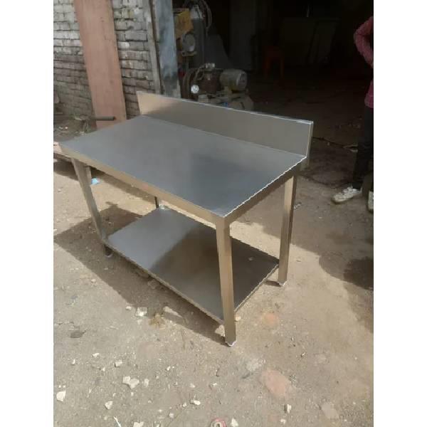 Polished silver stainless steel work table for hotel use, 4 feet in size. Features one undershelf and a customized design. Constructed from high-quality stainless steel with a polished finish.