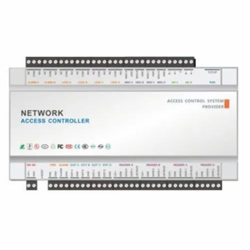 Housys Double Door Access Controller with TCP/IP connectivity. Supports 8 card readers, release button, fire alarm, door sensor, and door lock. Wired, portable installation for hotels, offices, schools, and colleges.