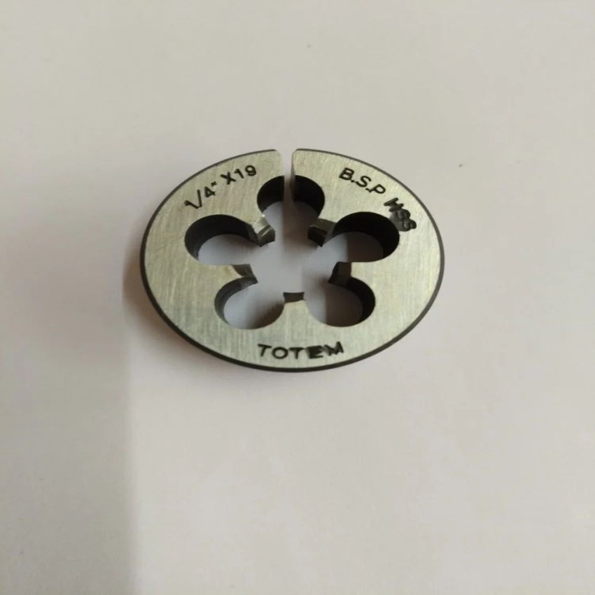 HSS round and hex die for various threading tasks. Crafted from High-Speed Steel for durability. Manufactured in India.