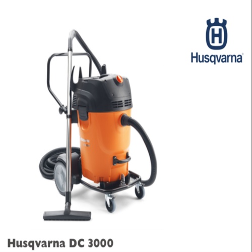 Husqvarna DC 3000 floor grinding machine with 2.4 kW power. Features 2x266.4m3/h air flow, 65L container capacity, 254 mbar max vacuum, and 27.5 kg weight.
