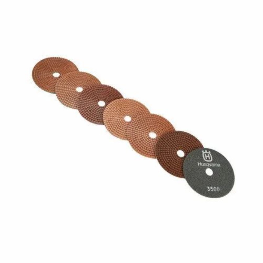 Husqvarna P1200 polishing pads, 75-125mm diameter, 200-3000mm grid. Wet coolant compatible. Article 589 77 19-07. Professional-grade for concrete polishing.