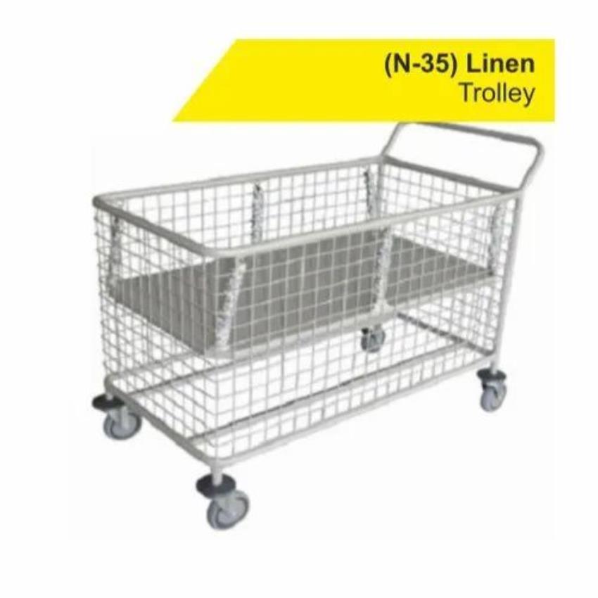 This industrial soiled linen machine is constructed from polished stainless steel, featuring 4 wheels and a 300 kg capacity. Model N34.