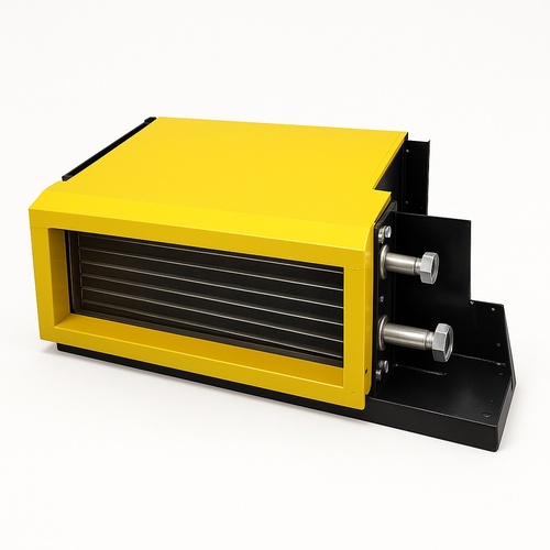 Industrial use fan coil machine with 400 CFM (680 CMH) airflow. Features 1 HP motor, 5/8 inch coil connection, 50 Hz frequency, 240 V voltage, and mild steel construction in yellow.