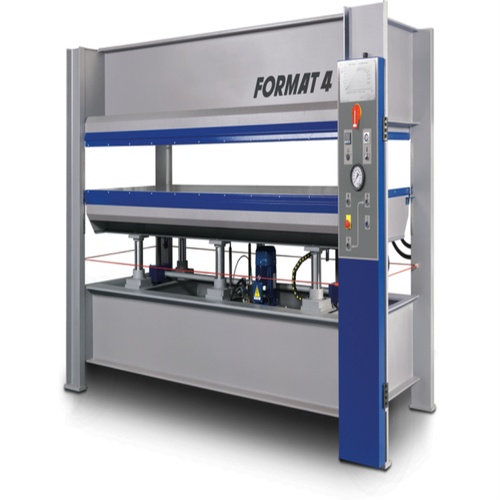 Automatic Mild Steel Plywood Hot Press Machine. Features oil heating up to 120 degrees Celsius. Model HVP Type 3 Format 4. Suitable for industrial plywood pressing applications.