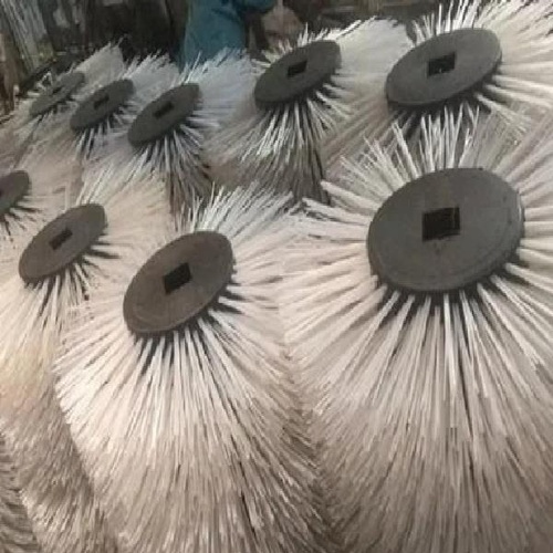 Round, hard nylon wheel brush for road cleaning. 530mm diameter, 11-15 inch brush size. White color, Made in India.