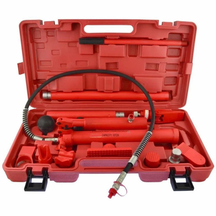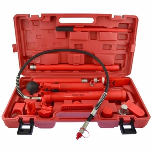 10-ton pushing capacity hydraulic denting kit for the automobile industry. Made in India, packaged in a case box. Powered by hydraulic systems.