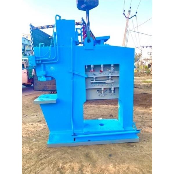 Semi-automatic mild steel hydraulic H type press, 150 Ton capacity. Features 15kW power, 440V, 3-phase operation. Industrial application, wooden box packaging.