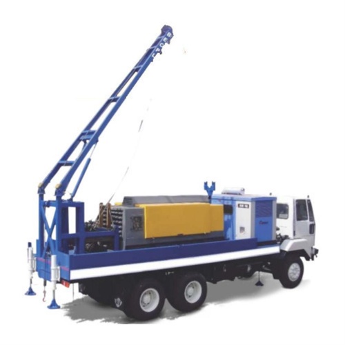 Hydraulic test pump unit with 5-ton hoist capacity, 8 mtrs/min speed. Features 4 leveling jacks, 11782 kg max capacity each. Handles 300 mtrs submersible pump depth.