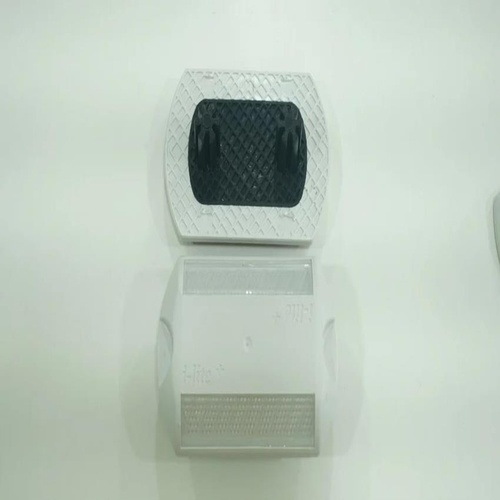 Round, white ABS body road stud for road application. Durable construction, Made in India. Enhances road visibility and safety.