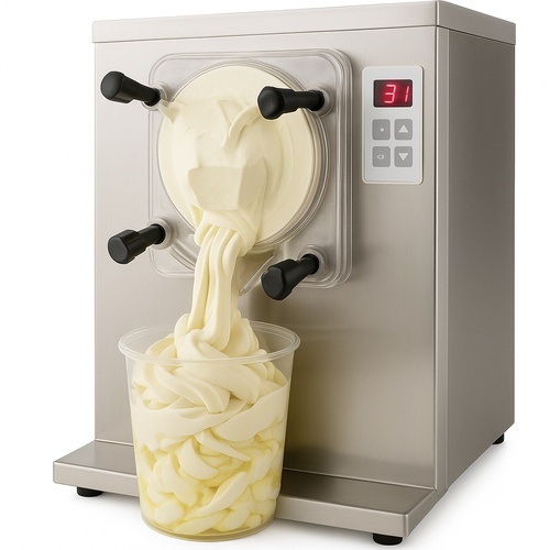 Semi-automatic soft serve ice cream mixing machine made of SS. Features a digital display and an output of 10 L per hour.