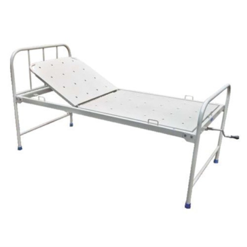 Manual ICU Fowler bed, constructed from mild steel, with adjustable head and leg elevation. Dimensions are 2030mm x 900mm x 600mm and it includes 4 wheels. Color: white and blue.